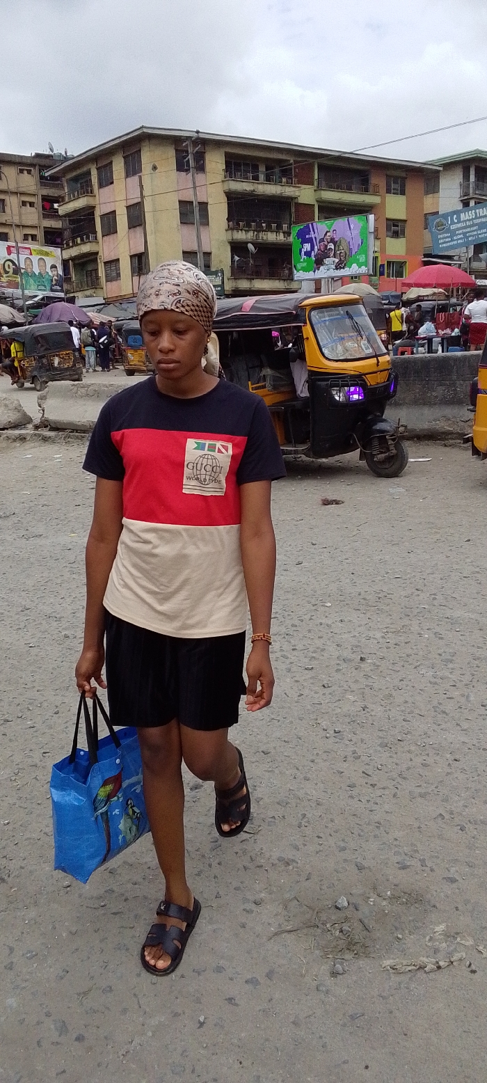An outdoor street scene in the city of Unknown, Nigeria, observed under an overcast sky