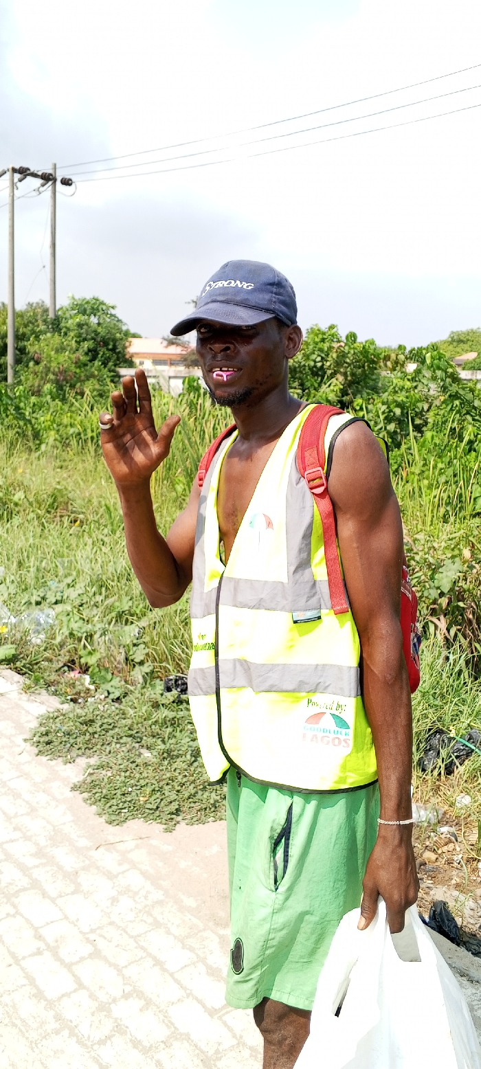 The image depicts a male subject standing outdoors on a paved surface in Awjaw, Nigeria. The individual is an adult male with a dark complexion, wearing a blue baseball cap with "STRONG" visible on the front, a yellow high-visibility vest with reflective strips and logos (including "Volunteer" and "Powered by: GOODLUCK LAGOS"), and green athletic shorts. He has no shirt on under the vest. A pink/purple object is visible in his mouth. His left hand is raised, palm forward, with fingers slightly splayed, and a light-colored ring is on his left ring finger. His right hand holds a white plastic bag, and a light-colored beaded bracelet is on his right wrist. The subject is positioned with overgrown green vegetation, including tall grasses and bushes, behind him. Visible within the vegetation are several plastic bottles and other litter. In the upper left background, utility poles and power lines are present. A building with an orange roof is partially visible through the vegetation in the mid-ground. The ground immediately around the subject is a light-colored paved surface, possibly interlocking bricks, with patches of small green ground cover. The sky is overcast.
