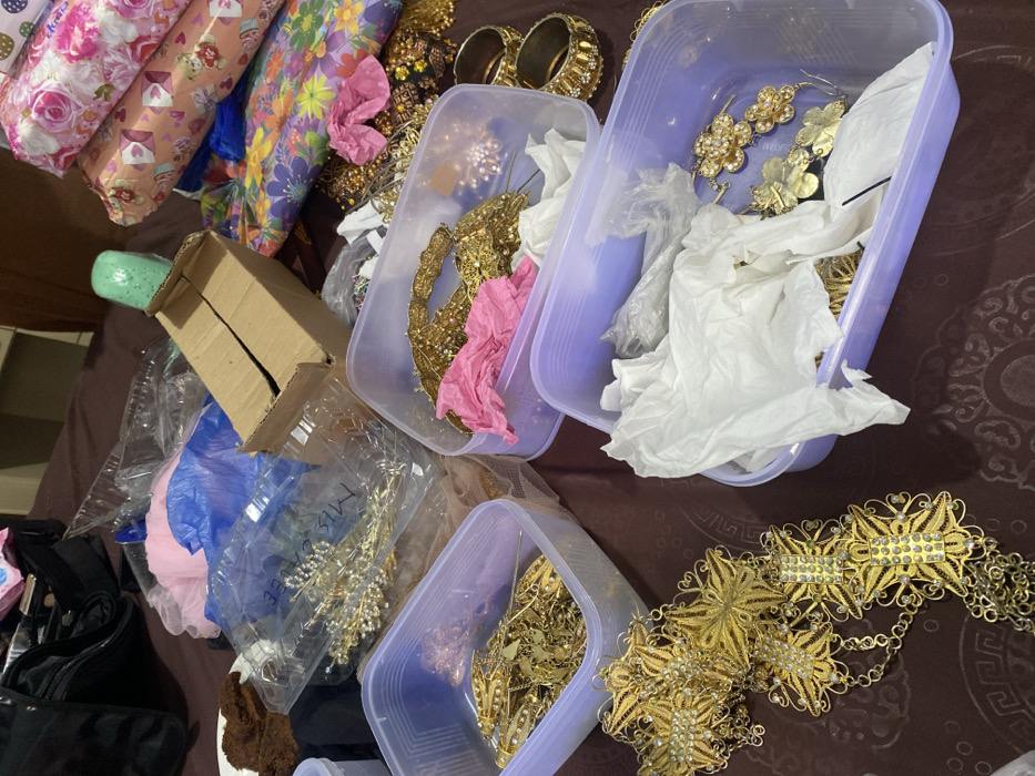 A chaotic scene displays an array of items on a brown surface. Plastic containers, some filled with golden jewelry, dominate the view. Bangles, hair accessories, and intricate floral designs are visible. Gift-wrapped packages with floral and heart patterns rest to the side. A small cardboard box and blue plastic bags contribute to the clutter. Some of the jewelry is embellished with rhinestones, adding sparkle to the scene.