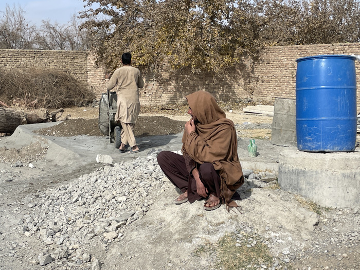 The image depicts an outdoor construction or work site in Nakhonay, Afghanistan, under clear daylight conditions