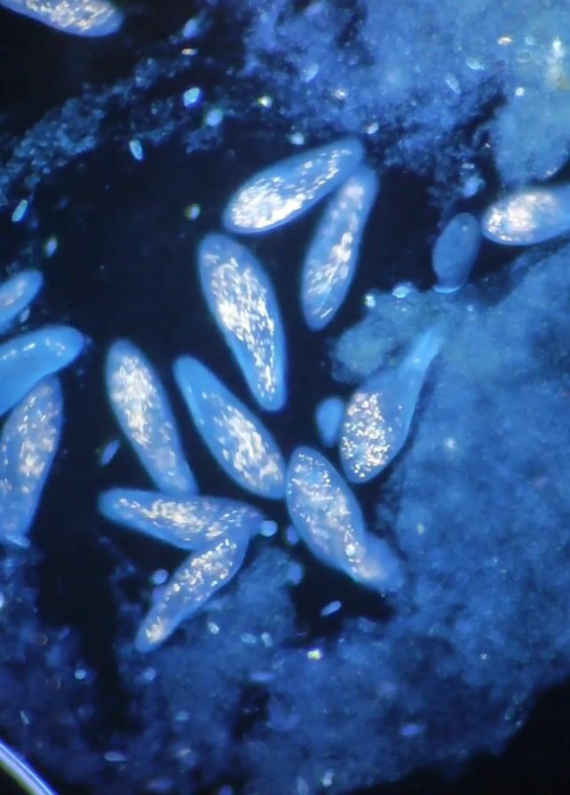 close-up, microscopic view of numerous paramecium, illuminated in a blue-ish glow. They are translucent with internal granules and are moving slowly in a dark environment with some cloudy matter.