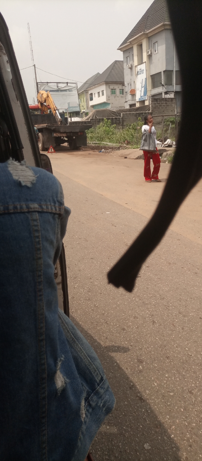The image depicts an urban street scene in Ogbunike, Nigeria, observed from a low vantage point, likely from inside a moving or parked vehicle. In the immediate foreground, to the lower left, a person's left leg clad in distressed blue denim jeans is partially visible. A dark, elongated shadow is cast on the light grey asphalt road surface in the lower right. Centrally positioned on the right side of the road, a dark-skinned female individual with dark hair is standing, facing left. She wears a light-colored long-sleeved top and loose-fitting red trousers with light-colored open-toed sandals. Her right hand is raised near her face, possibly holding a small object. Further down the road, a dark-colored flatbed truck is parked or stopped, its rear facing the viewer. A yellow excavator is loaded onto the truck's bed. Directly behind the truck, on the road, a red triangular warning sign with a white exclamation mark is visible. In the background, multiple multi-story buildings are present. The most prominent is a light grey building with a dark grey sloped roof, featuring multiple windows and air conditioning units. Adjacent to it are other buildings with similar architectural styles. A large billboard displaying the text "STAN CHIMASON ROOFING TILES" with a graphic of a roof is situated behind the truck and to the left of the main building. A concrete block wall separates the roadside from overgrown green vegetation and some of the structures. The sky is overcast and light grey. Utility poles and wires are also visible.