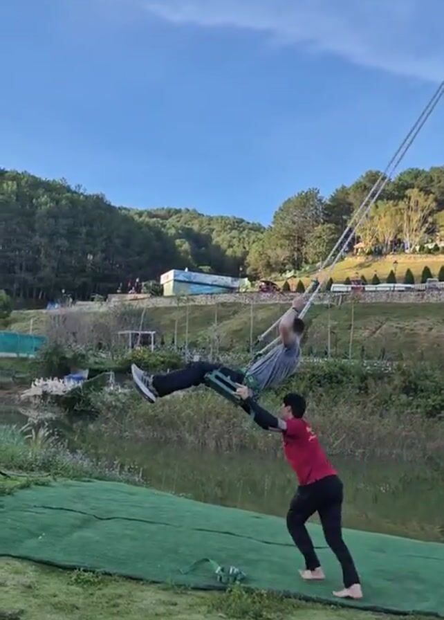 A man is riding a swing near a pond on a grassy area, with a building in the background. The swing is attached to a tall, white pole, and the man is wearing a grey t-shirt and black pants. Another person, wearing a red shirt and black pants, is pushing the swing to help the man gain momentum. The background features a pond, trees, and a large, ornate building on a hill. The sky is blue with some clouds. The man swinging is barefoot.