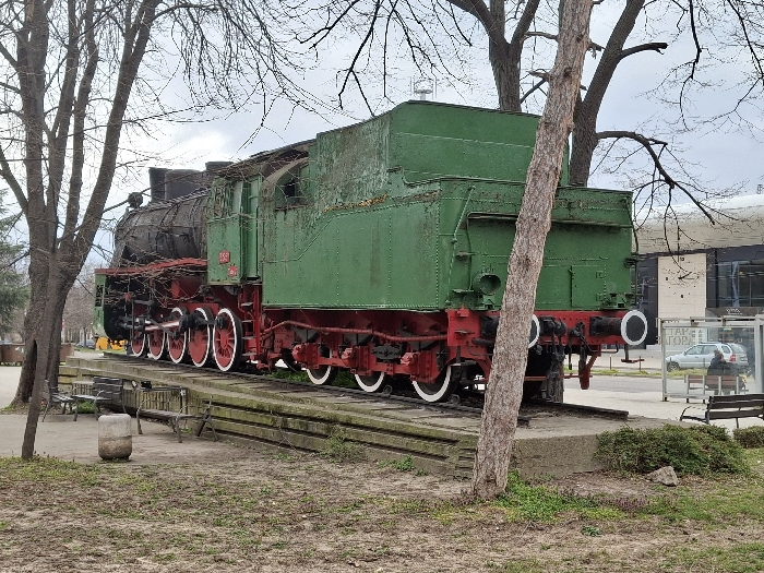 A static display of a vintage steam locomotive and its tender is depicted in Stara Zagora, Bulgaria