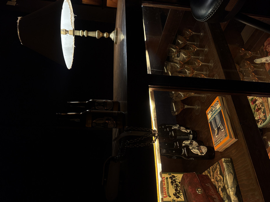 An angled view showcases a dimly lit shelf with a lamp on the left. Two beer bottles sit beneath the lamp. A glass-fronted section of the shelf displays rows of wine glasses. Below, two more beer bottles and a book titled "Klaus Gordon" can be seen. Additional books are visible on the bottom shelf, including one titled "Cleopaira". A bicycle seat is affixed to the top corner.