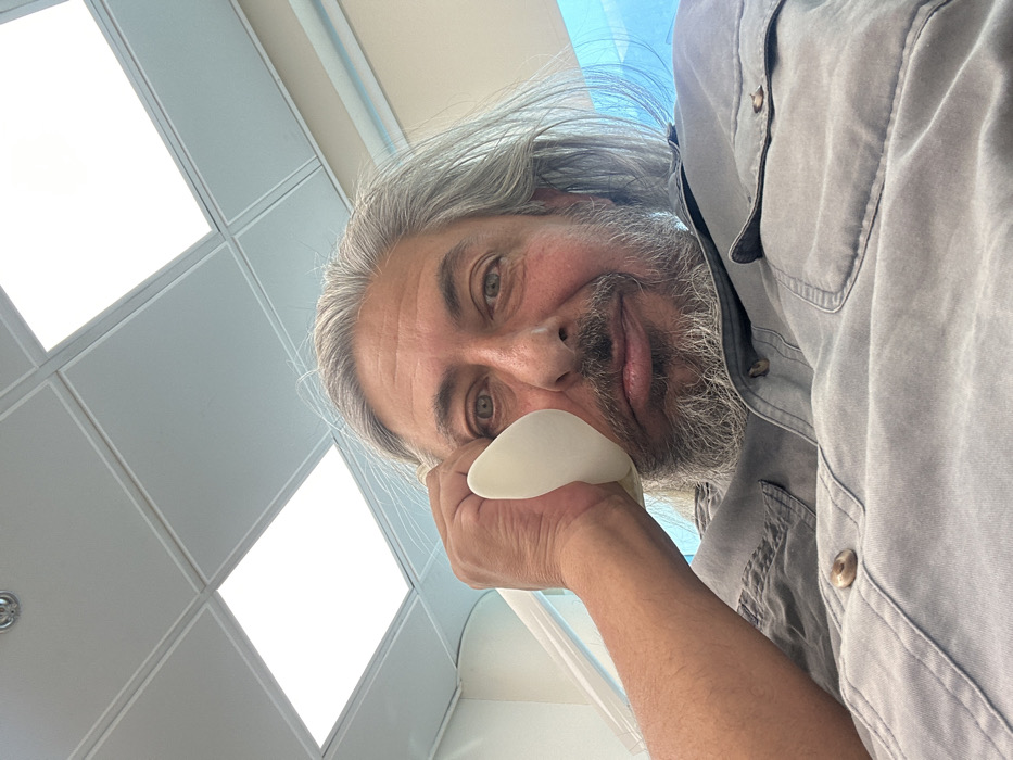 The image depicts an adult male, appearing middle-aged, with long, wavy grey hair and a full grey beard, looking directly at the camera with a subtle smile. He is wearing a light grey or blue-grey collared button-up shirt with two chest pockets. His right hand holds a white, ear-shaped object, consistent with a custom ear mold or impression, pressed against the right side of his face, covering part of his temple and cheekbone. The background indicates an indoor environment, likely a clinical or medical facility. A white drop ceiling with recessed rectangular fluorescent light panels, some illuminated, is visible, along with a circular fire sprinkler head or smoke detector in the upper left. Light-colored walls are present, with a partial view of a light blue vertical architectural element on the right and a white horizontal bar, potentially a medical apparatus, on the left. This scene is located in Netanya, Israel; however, the precise facility or address within the city cannot be determined from the visual information provided.