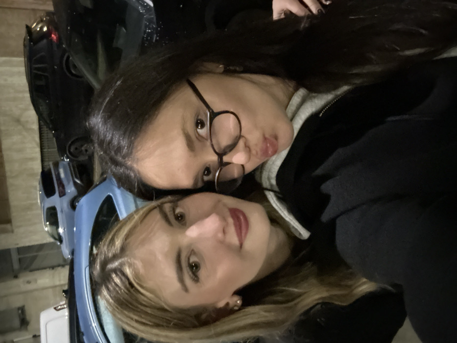 Two young women pose closely together for a selfie in an outdoor setting, possibly a parking garage