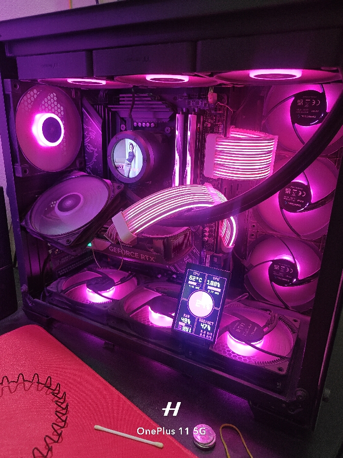 close-up view of the inside of a computer case, illuminated with pink LEDs. The case contains numerous fans, a motherboard, and a graphics card. There is a small LCD display attached to the case, showing system information. The environment is a room with a red mat and a piece of string. The image was taken in Rajshahi, Bangladesh, at the coordinates 24.388 latitude, 88.592 longitude. The scene is static, depicting a computer system that is presumably switched on and in operation. There are no people or objects present. No actions or interactions are taking place. The environment is indoors, with a red mat and string visible.