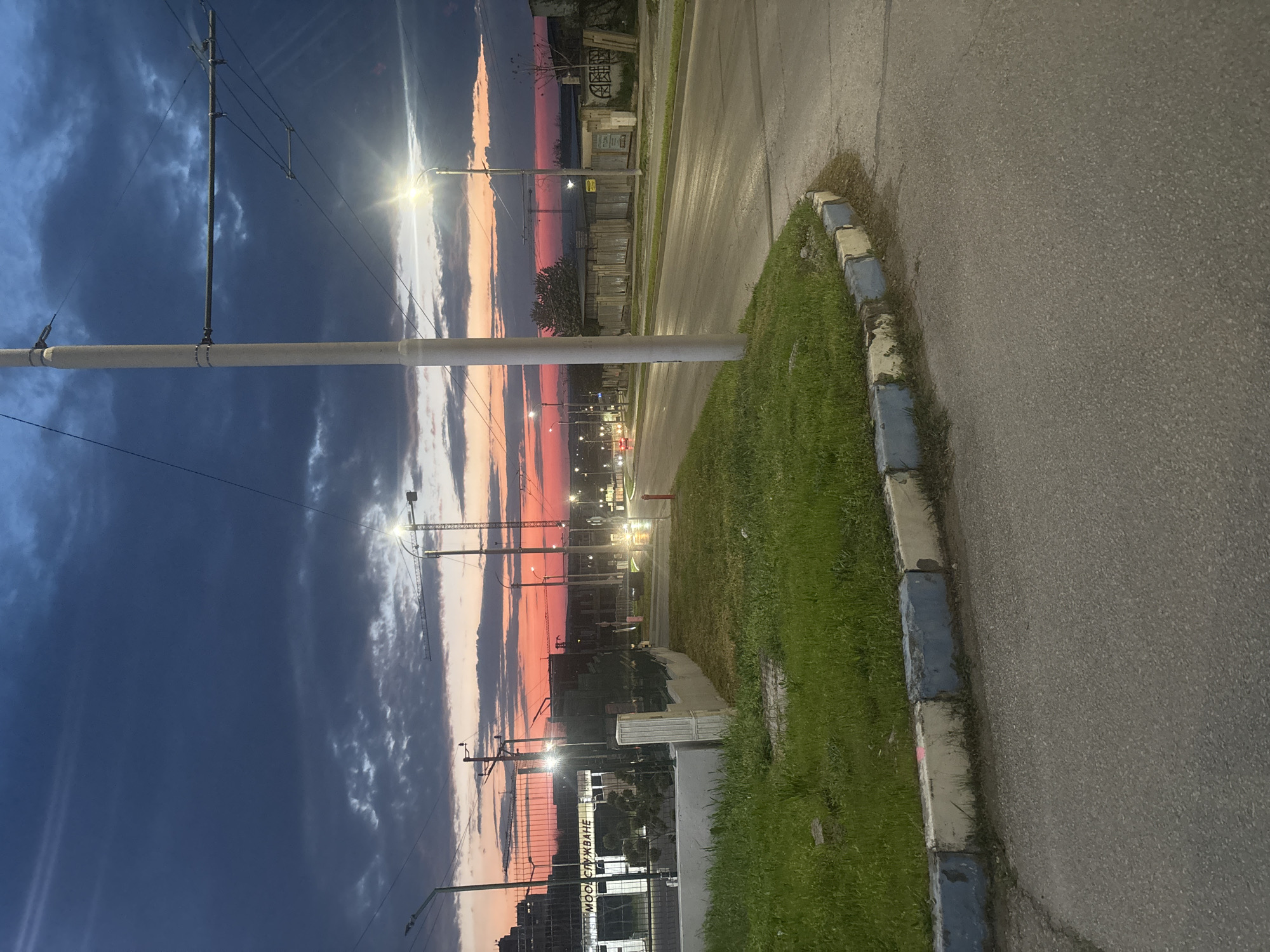 A ground-level view shows an urban street at dusk in Pleven, Bulgaria. The sky is streaked with hues of red, orange, white, and blue. A street runs parallel to the right edge of the frame, with a grass verge and painted curb between the road and sidewalk. Utility poles line the street, and power lines stretch overhead. Streetlights illuminate the road. Buildings are visible in the distance. A crane is visible within the buildings. Signage is partly visible on buildings.