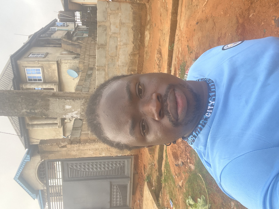A man poses outdoors wearing a light blue shirt with text around the collar. He is facing the camera with a slight smile. Behind him, a two-story building stands with a satellite dish on its side. The building's facade appears aged and weathered. A gray gate is visible closer to the foreground. The ground around the man consists of dirt and some scattered greenery. The photo is taken from a low angle, and it has been rotated, causing the scene to appear sideways.