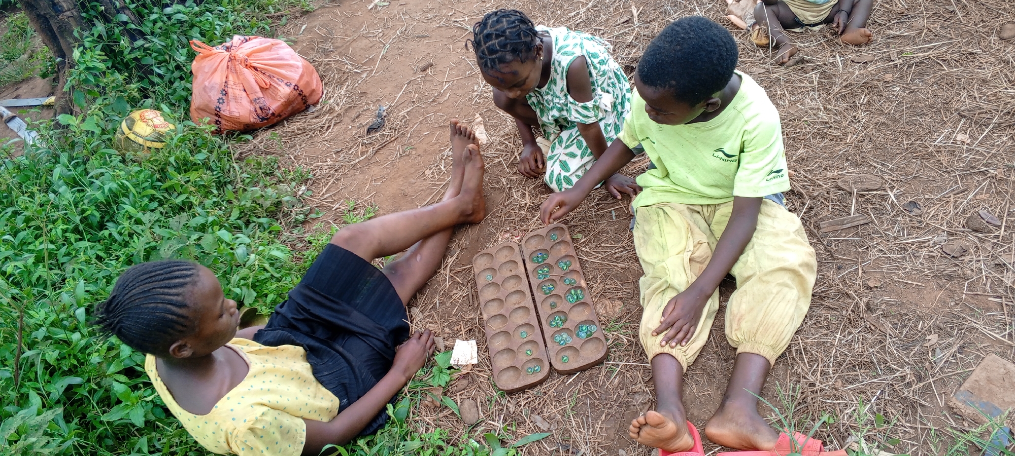 In Ngalula, Democratic Republic of the Congo, four children are positioned on the ground amid grass and bare earth. One child lies on their back, wearing a yellow and black outfit, facing towards the left of the image. To their right, two children kneel and sit, respectively, playing a game with a wooden board filled with green marbles. The child on the left wears a green and white dress, while the other child is dressed in a light green shirt and yellow trousers. In the background, partially visible, is another child. A soccer ball and an orange plastic bag are situated near some green vegetation.