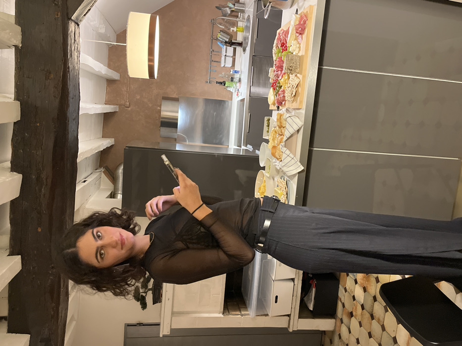 A young adult female with dark, curly hair and brown eyes stands indoors, looking directly at the viewer with a slight smile. She wears a sheer black long-sleeved top over a darker inner garment, dark pinstriped wide-leg trousers, and a black belt. Her left hand holds a smartphone, while her right hand is slightly raised towards her upper chest. She wears a thin gold necklace and a dark bracelet on her left wrist. The setting is a modern kitchen within an older building, consistent with an apartment in Paris, France. The ceiling features prominent dark wooden structural beams interspersed with white painted rafters. The flooring on the left is a hexagonal tiled mosaic pattern in muted earth tones. To the woman's right, a contemporary kitchen area is visible with sleek grey flat-panel cabinets, a light-colored countertop, and a stainless steel sink. A dark, possibly black, refrigerator stands on the left side of the kitchen, and a stainless steel wall-mounted range hood is visible above the counter. A white drum-shaped pendant light with a copper band hangs from the ceiling. The wall behind the kitchen features a reddish-brown, textured finish. On the kitchen countertop, a substantial spread of charcuterie and cheese is arranged on two wooden cutting boards. This includes various cured meats, an assortment of cheeses, grapes, olives, crackers, and nuts. Alongside this are bowls containing snacks like chips and dips, and a woven basket filled with bread rolls. To the woman's left, a white, historic-looking structure resembling an old hearth or oven is present, topped with a small bonsai tree. Below this structure, translucent plastic storage bins are visible on shelves. A portion of a black modern chair is visible in the bottom left foreground.