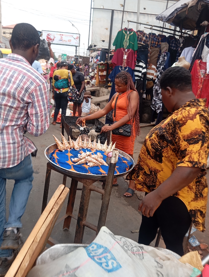A bustling outdoor market scene showcases people and wares. A woman in an orange dress tends to a charcoal grill, near a tray of cone-shaped foods on a blue patterned cloth. A man in a checkered shirt and jeans stands nearby, partially obscuring the view. Another woman, wearing a yellow and black patterned shirt and black pants, is seen from the side. Clothing hangs overhead, suggesting a makeshift store, contributing to the lively atmosphere.