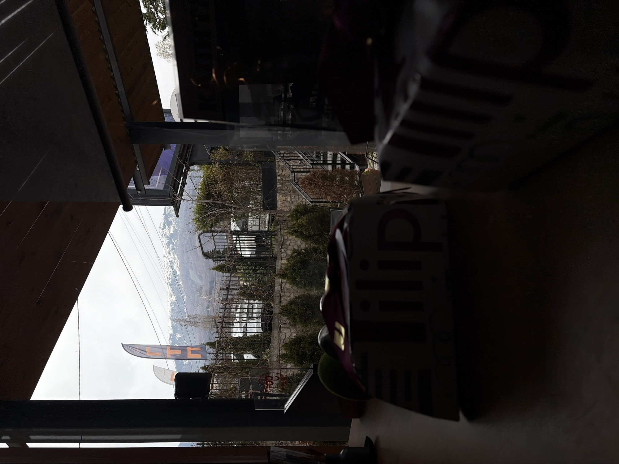 This image shows an outdoor scene viewed from an indoor location. The viewpoint appears to be from a restaurant or cafe, with structural elements of the building visible in the foreground, including a roof and supporting beams. Outside, a view of a mountainous landscape is seen through a window. The hillside appears partially covered in snow. Flags are visible in the middle ground. A stone wall borders the property. The location is in Sofia, Bulgaria.
