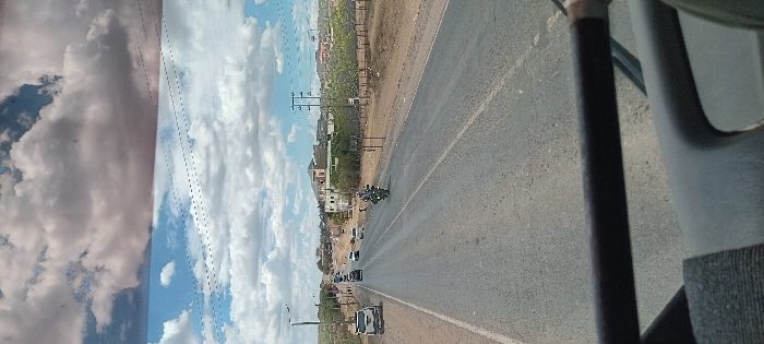 A slightly tilted shot shows an asphalt road winding through a landscape under a partly cloudy sky. Buildings and greenery line the side of the road, accompanied by utility poles. A motorcycle and several vehicles are visible on the road, suggesting traffic. A portion of what appears to be a vehicle interior, specifically a pole and dashboard area, occupies the right edge of the frame, creating a sense of being inside a moving vehicle.