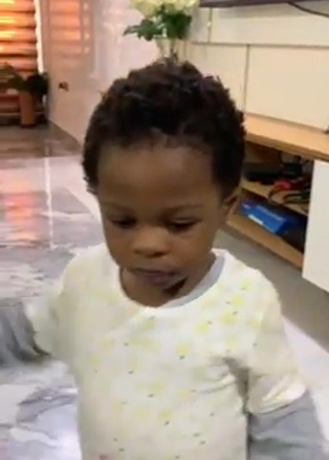 A young child stands in what appears to be an indoor hallway or living space