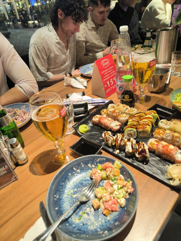 The image depicts an indoor dining scene at a Happy Bar & Grill restaurant, likely situated in Varna, Bulgaria, during an evening setting, indicated by the establishment's visible branding and the blurred city lights in the background. The central area of the frame focuses on a wooden dining table arrayed with food and beverages. Three male individuals are partially visible in the background, seated around the table. One man, positioned centrally, has dark, curly hair and wears a light patterned shirt, looking down towards his place setting. To his right, another man with short dark hair, also in a light patterned shirt, is similarly focused downwards. The left foreground shows the arm and shoulder of a third individual wearing a light-colored long-sleeve shirt. A large rectangular black platter on the table holds numerous sushi rolls of various types, some topped with sauces. A small portion of green wasabi accompanies the sushi, alongside two small black dishes, one containing dark soy sauce. In the immediate foreground, a blue ceramic plate contains the partially consumed remnants of a salad, composed of diced tomatoes, cucumbers, feta cheese, and croutons, with a silver fork resting on it. Two tall Stella Artois beer glasses, each containing golden liquid, are visible; one in the foreground is partially full, and another further back is mostly full. A green glass bottle, a clear plastic water bottle, and a small Kikkoman brand soy sauce bottle with a green cap are also on the table. A small bowl with purple cabbage salad is visible on the far left. Additional items on the table include white napkins, wrapped chopsticks, a metal holder containing salt and pepper shakers, and a metal pitcher. A prominent red and white triangular sign displays the "Happy" logo and Bulgarian text advertising a "15% discount." The overall scene captures a group dining experience in progress.