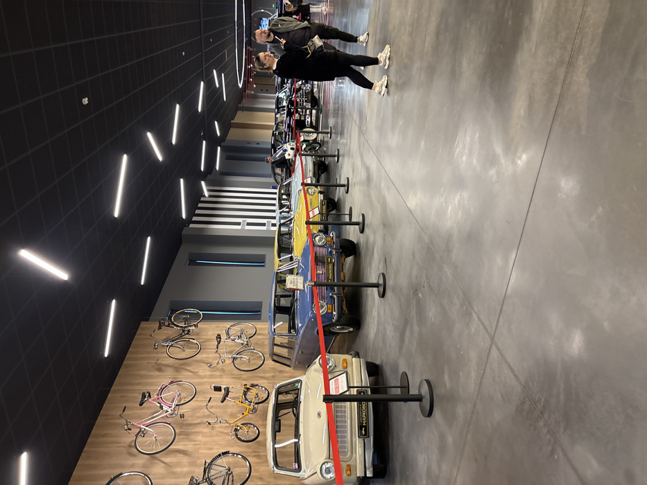 The scene is an interior view of a vehicle museum located in Markovo, Bulgaria, indicated by "МУЗЕЙ НА МАРКОВО" signage on exhibits. The large, well-lit space features a polished light grey concrete floor and a black grid ceiling with linear LED lighting. The left wall, paneled in light wood, displays several vintage bicycles mounted at varying heights, including a pink women's bicycle, a dark men's bicycle, a yellow children's bicycle, and a silver men's bicycle. A linear arrangement of vintage automobiles is positioned on the floor, restrained by red barrier ropes on black stanchions. In the foreground, a beige Trabant 601 sedan is followed by a blue Lada/Fiat 124 station wagon, then a yellow sedan, and other classic cars, including darker sedans and a lighter-colored SUV-type vehicle, receding into the background. Multiple motorcycles are visible at the far right background. Two individuals, a woman and a man, occupy the mid-ground. The woman, wearing a black top, black leggings, and white sneakers, walks from right to left, carrying a dark shoulder bag. The man, with a beard and dressed in a grey jacket, dark trousers, and white sneakers, walks alongside and slightly behind her, also moving from right to left. Both appear to be observing the exhibits. Additional museum visitors are visible further in the background.