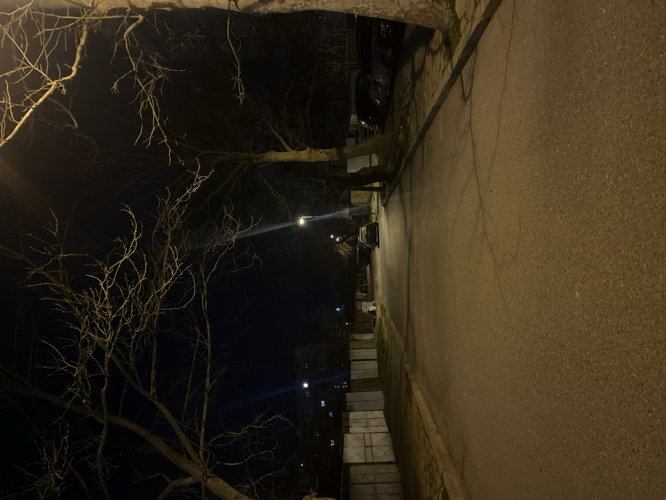 The image displays an urban street at night within the city of Sliven, Bulgaria. An asphalt road, illuminated by artificial light sources, extends into the background. On the left, a concrete sidewalk parallels a continuous row of light-gray, panelized garage or storage units. Beyond these structures, deciduous trees with bare branches are visible, and in the distant background, multi-story residential buildings with illuminated windows can be observed. A prominent blue light streak, indicative of a lens flare, originates from an unidentified light source in this distant left quadrant. On the right, a paved sidewalk is bordered by several tall, leafless deciduous trees. Behind these trees, a line of at least five dark-colored vehicles is parked. A bright, white-yellow street light on the right side illuminates the foreground and mid-ground, casting shadows and generating a distinct white light streak (lens flare). A single dark-colored vehicle is parked further down the road on the right. No individuals are present, and no actions or interactions are depicted. The sky is dark, suggesting a clear night.