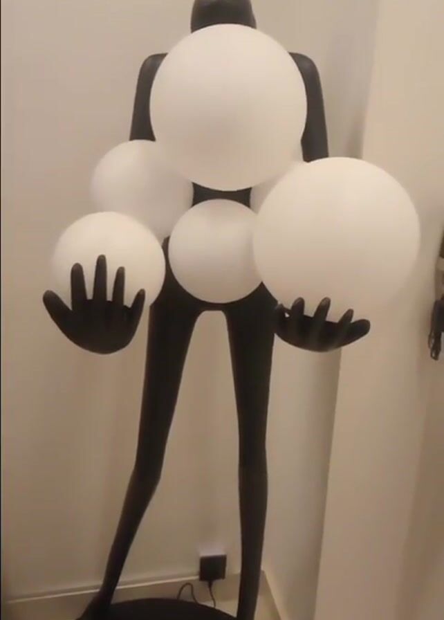 black statue of a slender figure holding five white, spherical light fixtures