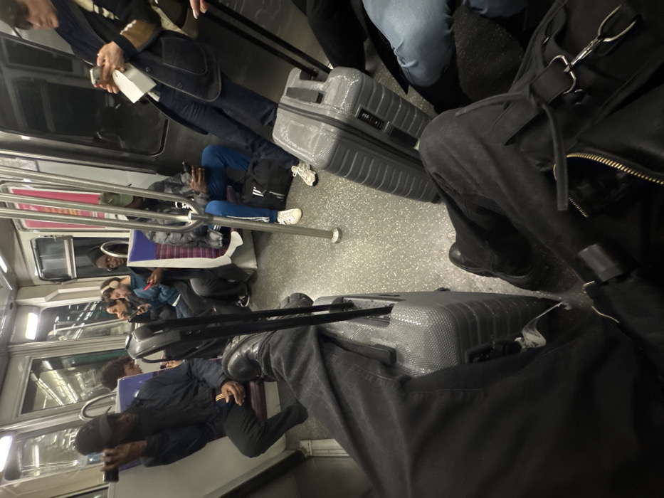 The image depicts the interior of a public transport train carriage, operating within the city of Gennevilliers, France. The perspective is from a seated passenger looking forward into the carriage. In the immediate foreground, the photographer's legs are visible, clad in dark trousers and dark shoes, with a dark bag resting on their lap. A grey, hard-shell suitcase with an extended handle and textured surface is positioned on the floor between the photographer's feet. On the left side of the carriage, a male passenger wearing a dark jacket and a black baseball cap is seated, holding a dark mobile phone to his left ear. Behind him, a second passenger with curly hair is visible, looking down at a device. Further along the left side, two more individuals are seated, each viewing a mobile phone; one wears headphones and a blue jacket, the other a dark jacket. A person with a dark head covering is partially visible between these seated individuals. On the right side of the carriage, a male passenger wearing a grey puffer jacket, a camouflage-patterned baseball cap, and blue track pants with white stripes, is seated directly on a black duffel bag placed on the floor. He is holding and viewing a mobile phone. Another grey, hard-shell suitcase with a combination lock and textured surface is positioned on the floor to his right. Further right, a passenger in a dark coat and blue scarf is standing or leaning, holding a mobile phone and a white document. The lower legs of an additional passenger, wearing light blue jeans, are visible at the far right of the frame. The train interior features a grey speckled floor, white and light-colored wall panels, silver vertical support poles, and seats with purple and white striped upholstery. Overhead strip lighting illuminates the carriage. Windows show reflections or an indistinct dark exterior. Most visible individuals are engaged with personal mobile devices.