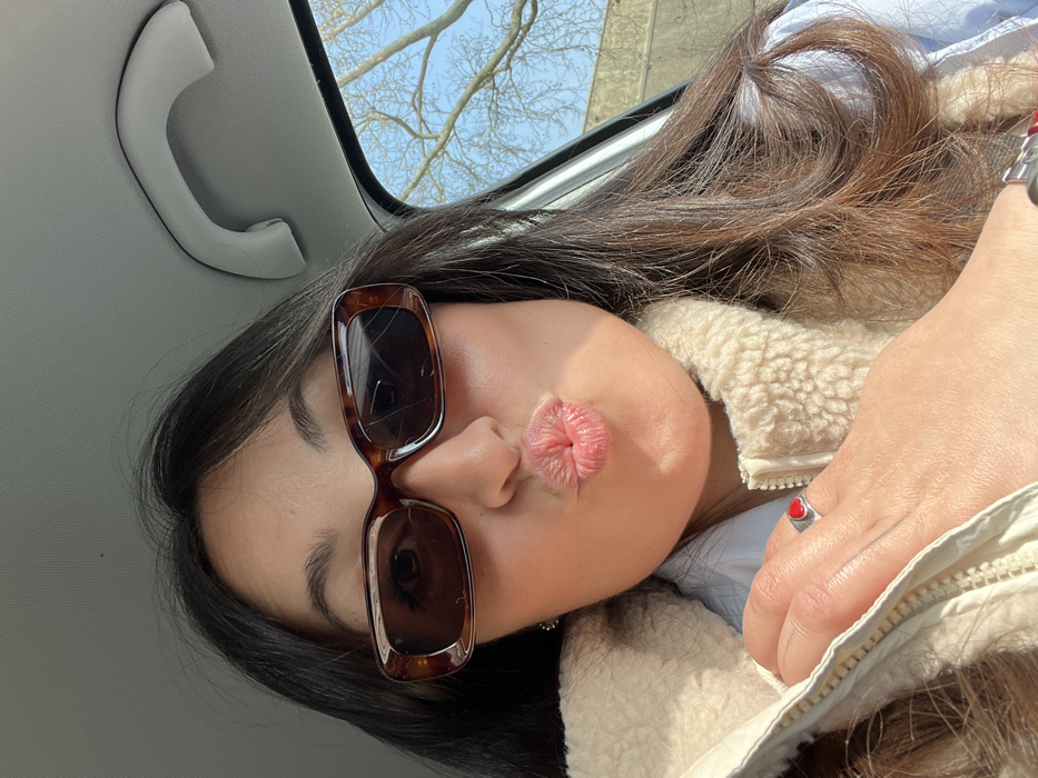 An adult female is depicted in a close-up photograph, likely a selfie, taken from inside a vehicle. She has long, dark brown hair and is wearing tortoise-shell framed rectangular sunglasses. Her lips are puckered. She is dressed in a light-colored, possibly beige, sherpa-lined jacket or vest over a light blue collared garment. A silver-toned ring with a red heart-shaped inlay is visible on her left ring finger. The vehicle's interior features a gray headliner and a gray grab handle above the passenger door. Outside the vehicle, through a window, a clear blue sky with bare tree branches and a distant, out-of-focus light-colored building are visible. The ambient lighting suggests a sunny day. The specific location within Heilbronn, Germany, is not discernible from the visual evidence.