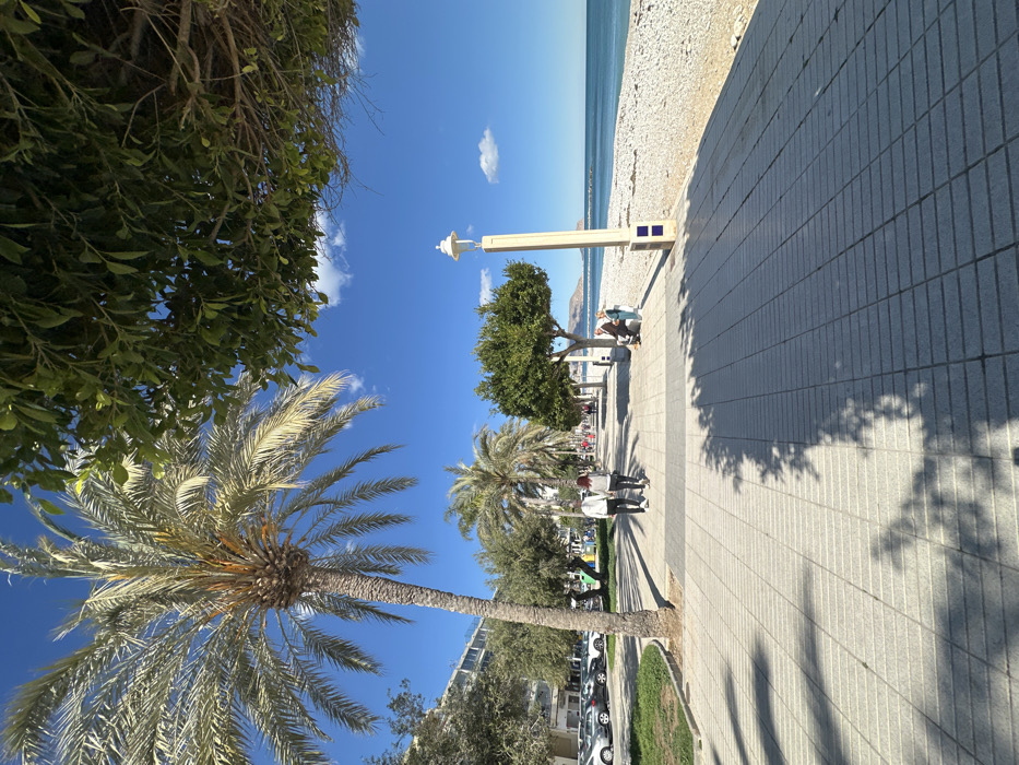 This image depicts a sunny day on a coastal promenade in Altea, Spain. The scene is dominated by a wide, tiled promenade paved with light-colored rectangular blocks, extending into the distance under a clear blue sky with minimal white clouds. On the left side of the promenade, a large palm tree stands prominently in the foreground, casting shadows onto the pavement. Beyond it, a grassy strip separates the promenade from a street with multiple parked cars. Multi-story buildings line the street further back. Additional palm trees and various green leafy trees are planted along this side of the promenade. On the right side, the promenade borders a wide pebble beach that extends to the calm, blue-green sea. A single tall, light-colored lamppost with a distinctive white lantern top and blue tiled base is visible on the right edge of the promenade in the midground. In the far distance on the right, a landmass, possibly a mountain, and a distant breakwater are visible in the sea. Green, bushy trees also line this side of the promenade at intervals. Several individuals are present on the promenade. In the midground, two individuals are walking away from the camera. The person on the left wears a light-colored hooded top and dark pants, while the person on the right wears dark clothing. Further down the promenade on the right, three individuals are seated on a bench, facing the sea. Other indistinct figures are visible walking in the distance along the promenade. Bright sunlight illuminates the scene, creating distinct shadows from trees and structures on the pavement.