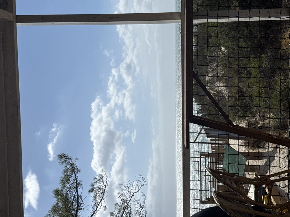 The image depicts a bright, daytime view from an elevated outdoor platform, likely a terrace or deck, overlooking a coastal area within the municipality of Grândola, Portugal. In the foreground, a wooden structural frame defines the viewing area, with a horizontal wooden railing or counter spanning the mid-section and a vertical wooden post on the right. A dark, mesh-patterned safety net is stretched beneath the horizontal bar. Partially visible on the far left are two light-colored chairs, possibly wicker, facing towards the ocean. A dark-clad individual's left shoulder is partially visible in the bottom-left corner, indicating a person seated. Beyond the platform and netting, a sandy beach environment is visible, characterized by undulating dunes sparsely covered with green coastal vegetation. A defined sandy pathway, bordered by wooden posts and small barriers, leads directly towards the ocean. A green informational sign is positioned on the sand near this path. The mid-ground features the Atlantic Ocean, its surface shimmering intensely with sunlight reflections, extending to a clear horizon line. The background is dominated by a bright blue sky with numerous scattered white cumulus clouds. On the far left, a portion of a pine tree, displaying its characteristic needles and branches, extends into the upper left quadrant of the sky. The scene is illuminated by strong, direct sunlight.