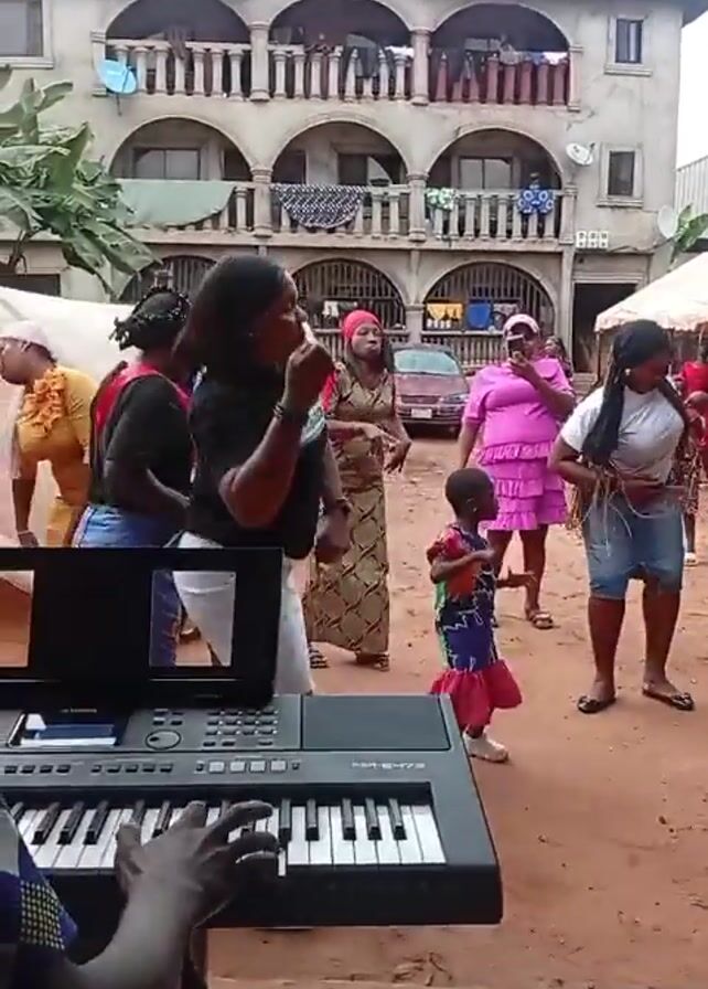 A group of people are dancing in an outdoor space, likely a courtyard or backyard. A man plays a keyboard while people dance around him. There are about ten people visible, mostly women, and two children. One woman is wearing a pink dress, another a denim skirt and white shirt. The children are dressed in patterned outfits. In the background, there is a multi-story building with arched balconies and laundry hanging out to dry. A red car is parked near the building. A white tent is set up on the right side of the frame. The ground is reddish-brown dirt.
