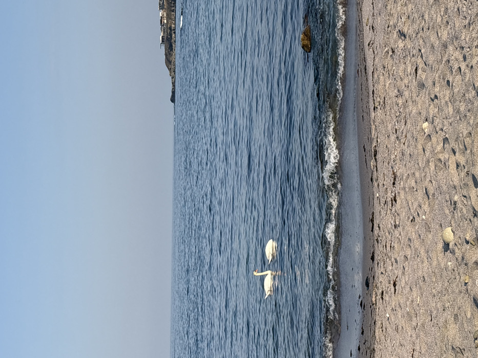 The image depicts a coastal scene in Tsarevo, Bulgaria, captured from a low vantage point on a sandy beach. The foreground features light tan sand interspersed with small pebbles and dark organic debris. Immediately beyond the sand, small waves with white foamy crests are breaking onto the shore in the dark blue-green water. Approximately five meters from the shore, two white swans are swimming together. The swan on the left has its head and neck upright, while the swan on the right has its head lowered, partially submerged, suggesting feeding or preening. A single large, dark-colored rock is visible in the water near the right edge of the frame, partially submerged by the waves. The sea extends towards the horizon under a clear, pale blue sky with no clouds. In the far background, on the right side of the frame, a rocky coastline or headland is visible, topped by several light-colored buildings or structures. The water appears calm beyond the breaking waves near the shore. No human figures are present.