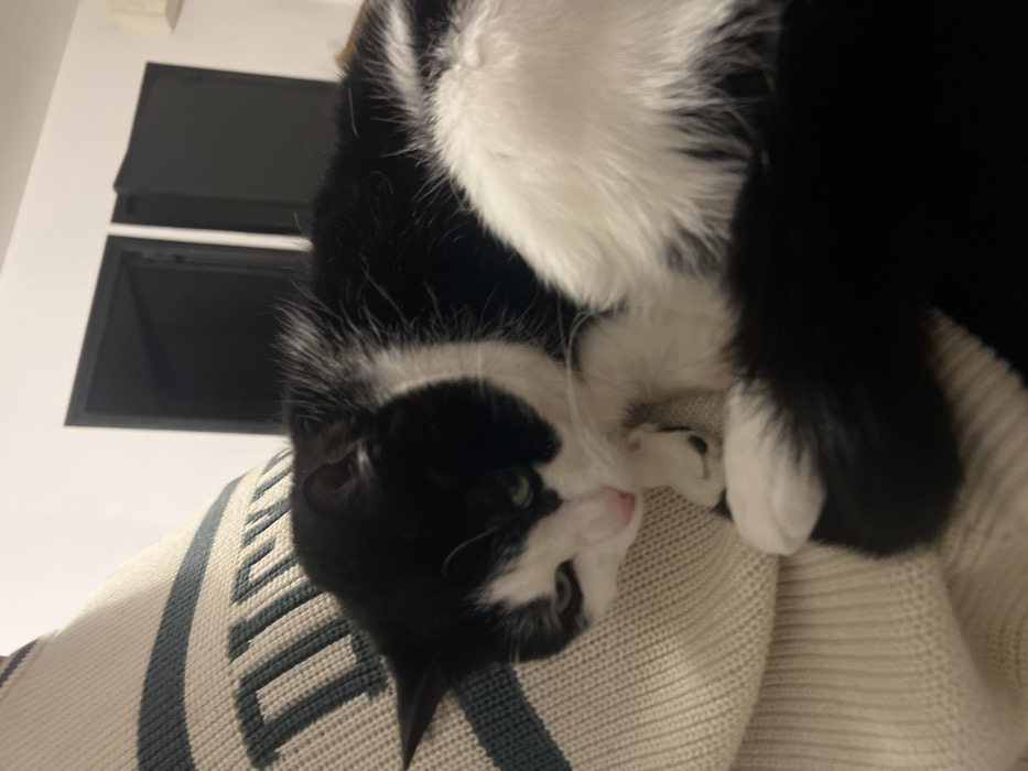 - "A black and white cat rests upside down on a pillow with a geometric pattern" by FM-sLRpr2, licensed under CC BY 4.0
