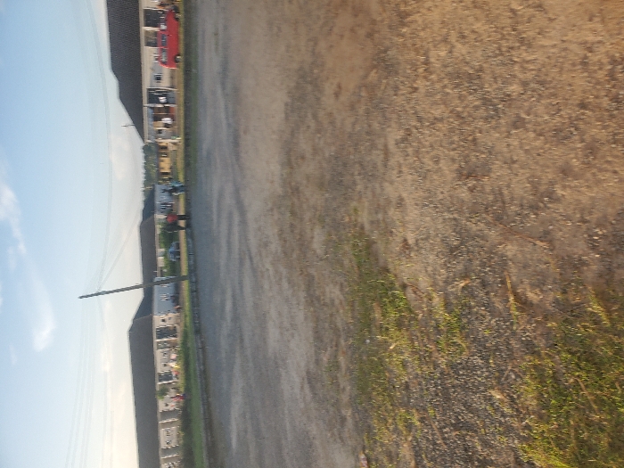 A gravel and dirt ground dominates the foreground, transitioning to a grassy edge. In the background, buildings with dark roofs line the horizon. A utility pole stands amidst them. Groups of people are scattered in front of the buildings, and a red vehicle is parked near the building on the right. The sky is bright, with light clouds.