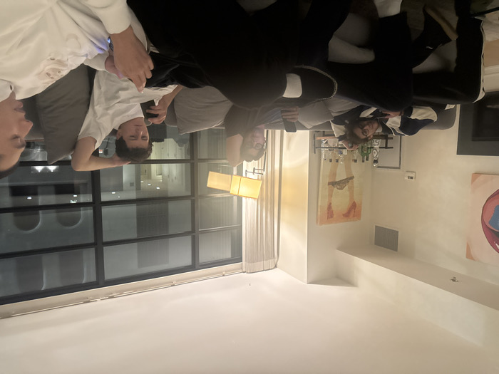 The image depicts an indoor scene within a modern residential living space in Boston, likely an apartment or condominium, at night