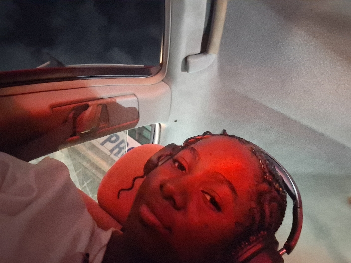 The scene is located within a vehicle in Lekki, Nigeria. A young individual with braided hair and dark skin is centrally positioned, looking directly at the viewer. The person wears dark over-ear headphones and a light-colored shirt. A strong red light source bathes the subject and the vehicle's interior in a red hue. The vehicle's interior features a light-colored headliner, a grab handle, and a visible window pillar with reflective trim and a control panel. An orange headrest with a black squiggly design is partially visible behind the subject. The exterior, viewed through the vehicle's windows, is dark and blurred, revealing white lettering "PR" on a dark surface, indicative of an external vehicle or structure.