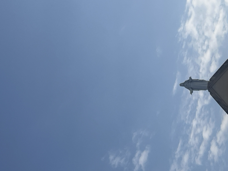 The image captures a low-angle view of a clear blue sky with scattered wispy clouds in the upper right. In the same section is a statue of a religious figure, possibly Jesus, standing atop a building's corner. The statue is white and positioned against the sky, creating a contrast with the blue and white background. The architectural element supporting the statue is visible as well, with a slightly beige tone.