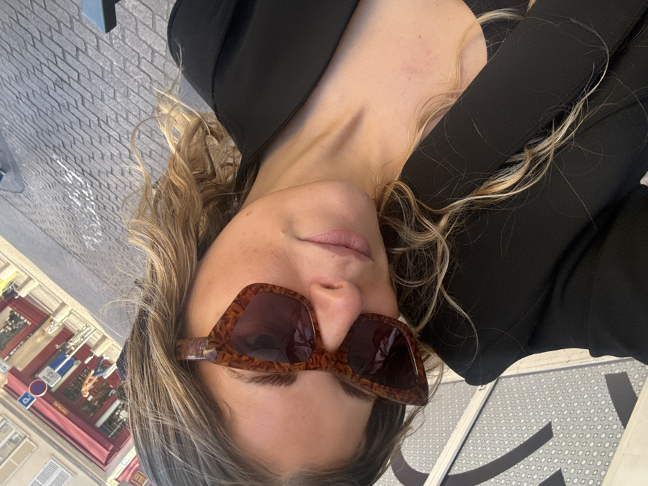 This image captures a close-up, diagonally oriented view of a female subject situated in an outdoor urban environment, specified as Nanterre, France. The subject, positioned in the foreground, is a fair-skinned individual with long, wavy blonde hair featuring darker roots, which cascades over her left shoulder and chest. She is wearing tortoise-shell patterned sunglasses with dark lenses, completely obscuring her eyes. Her lips are closed, presenting a neutral expression. She is dressed in a black blazer or jacket worn over a dark undergarment, with part of her upper chest visible. The background is out of focus, revealing a cobblestone street surface and, behind it, a building with a prominent red awning over what appears to be a storefront. A partially visible blue circular road sign with a red border and a diagonal line (indicating no parking), consistent with French street signage, is also present in the background. The scene is illuminated by natural daylight, suggesting daytime.
