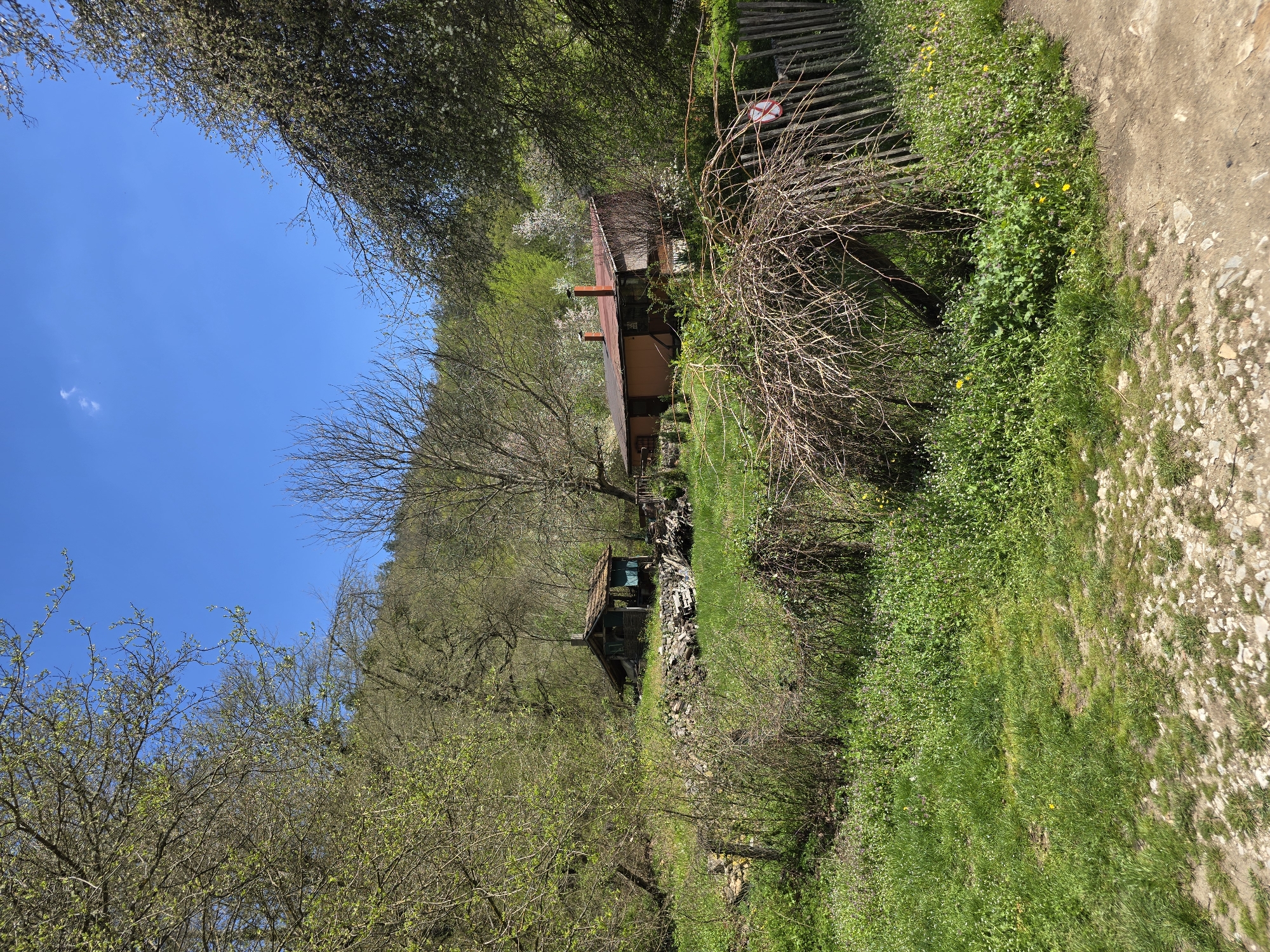 rural scene in Stoilovo, Bulgaria. A tan-colored house with a rusty red roof is nestled among trees and vegetation. A second, smaller wooden structure with a peaked roof is visible further down the hillside, also surrounded by greenery. A weathered wooden fence is present in the background. Lush green grass and various types of foliage cover the ground. The sky is clear and blue. A dirt path runs along the edge of the scene.