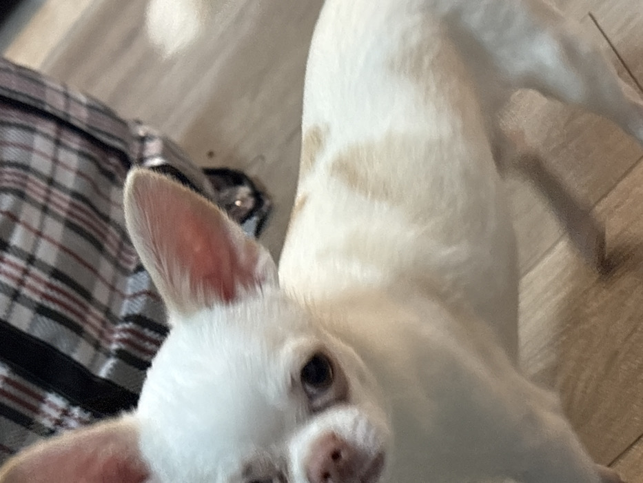 A white Chihuahua with light brown spots on its back looks directly at the camera. The dog's head is tilted slightly to the left, emphasizing its alert expression. The background includes a plaid shirt and a wood-patterned floor. The dog's large, pointy ears and shiny eyes create an endearing and inquisitive portrait.