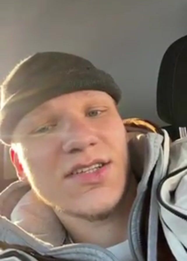 A young man with fair skin and light blue eyes, wearing a dark beanie, a gray and white hooded sweatshirt, and a short beard, is looking at the camera and talking. He is sitting in a car; the car's interior is visible. Sunlight is shining into the car from the left.