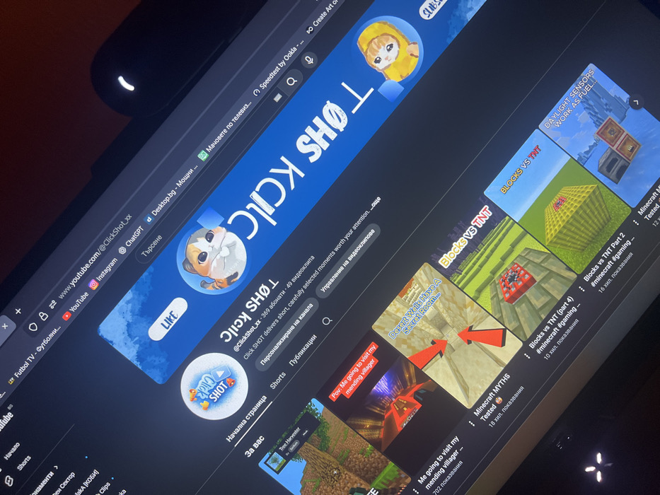 The scene is located in a room in Topolovo, Bulgaria, captured at an angle, focusing on a computer monitor in a dimly lit environment. The monitor displays a YouTube channel titled "ClickShot_xx," which features 369 subscribers and 49 videos. The channel's blue banner displays the stylized, rotated text "Click Shot" with a cartoon cat as the profile picture and another cartoon character in a yellow hoodie on the right side. Below the banner, several video thumbnails are visible, predominantly showcasing Minecraft-related content, with titles such as "Pov: Me going to visit my mending villager," "Minecraft MYTHS Tested," "Desert Walls Have A Secret Room...", "Blocks VS TNT (part 4)," "Blocks vs TNT Part 2," and "Daylight Sensors Work As Fuel...". The browser's tab bar is visible at the top, showing open tabs for "YouTube," "Instagram," "ChatGPT," and "Desktop.bg." A dark, elongated object, consistent with a wireless earbud charging case, exhibits a small, glowing white indicator light at the upper right edge of the monitor screen. The digital interface is in Bulgarian. No individuals are present or engaged in direct action within the frame.