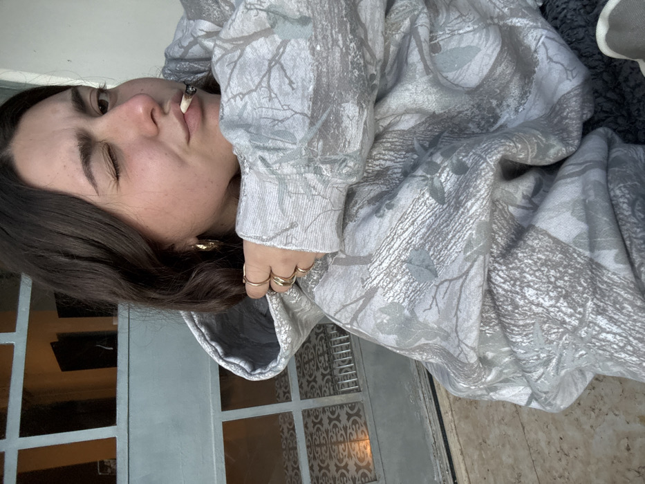 A person with shoulder-length brown hair, gold hoop earrings, and several gold rings is seen at a close-up, skewed angle. They are wearing a grey and white camo hoodie and holding a lit cigarette in their mouth. The person is squinting one eye. A window with small square panes can be seen in the background.