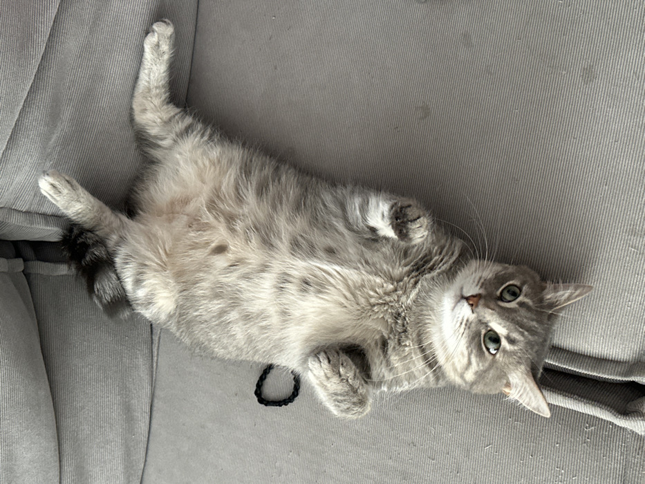- "A domestic cat is depicted lying on its back on a light grey, ribbed upholstered surface, consistent with a sofa or armchair" by FM-3OYS02, licensed under CC BY 4.0