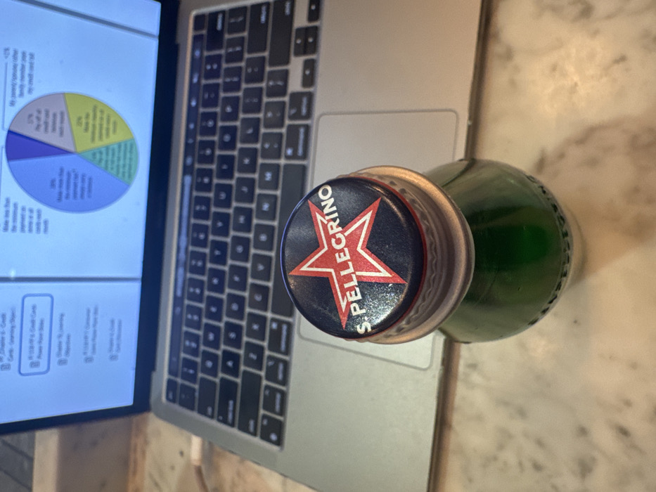 A laptop displays a pie chart on its screen, next to a keyboard and a bottle of S. Pellegrino sparkling water. The bottle's cap is blue with a red star and white lettering. The laptop sits on a speckled surface, likely a countertop. The bottle is partially obscuring the laptop's trackpad.