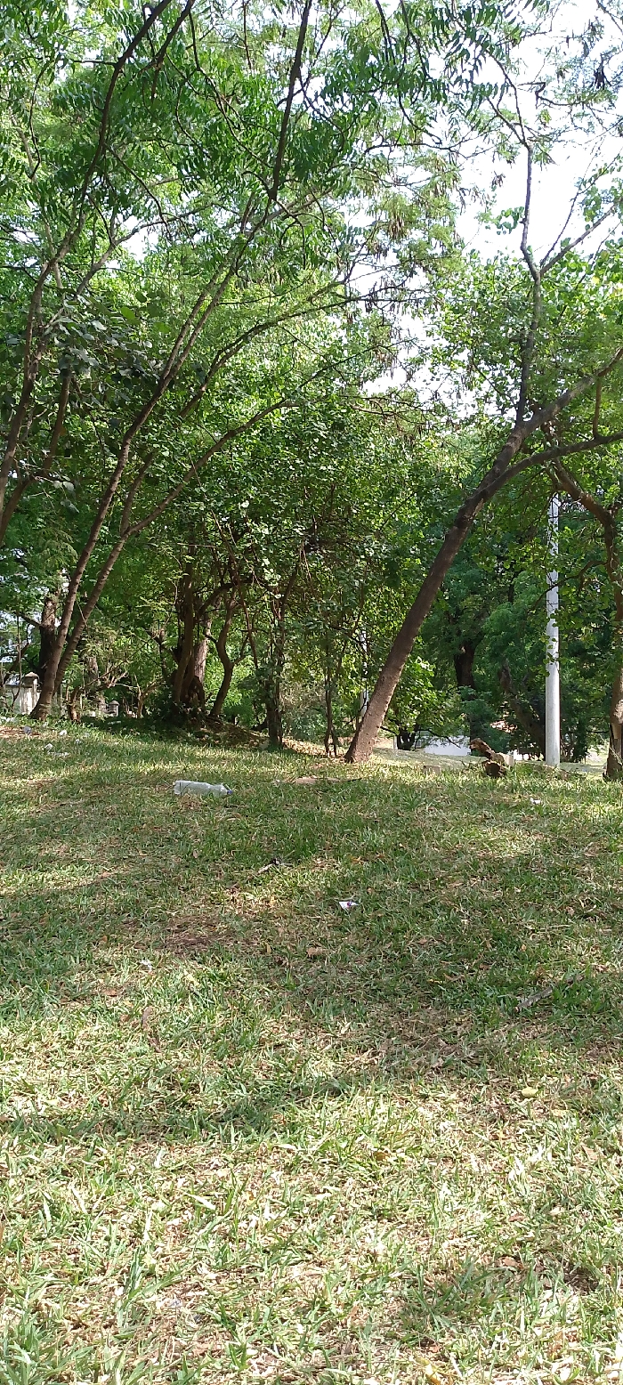 The image displays an outdoor scene in Tudor ward, Kenya. The foreground consists of an expanse of predominantly green grass, showing some drier, lighter patches. Litter is present on the grass, including a light-colored plastic bottle lying horizontally towards the center-left and several smaller pieces of white and colored debris scattered across the mid-right and foreground. The midground and background are densely populated with trees and foliage, featuring numerous visible tree trunks of varying sizes and angles. The trees bear abundant green leaves, with patches of bright sky visible through the canopy. A vertical white pole, possibly a utility pole, stands partially obscured by trees in the right background. The scene is illuminated by natural light, casting discernible shadows on the grassy ground, indicating daytime conditions. No individuals or animals are present.
