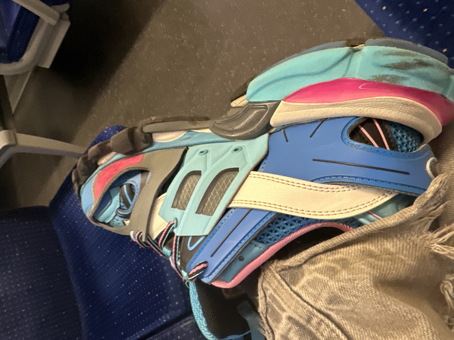 - "The image presents a close-up, elevated perspective of a person's left foot and lower leg, clad in a multi-colored athletic shoe and light gray distressed denim jeans, inside what appears to be a public transport vehicle" by FM-BrJS32, licensed under CC BY 4.0