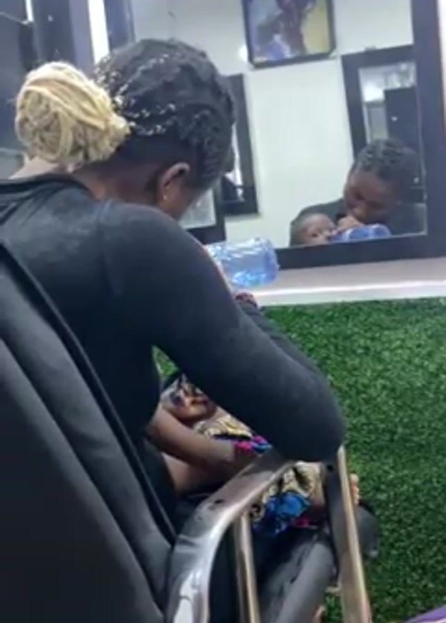 A woman is sitting in a black salon chair, facing away from the camera. She is holding a baby in her lap. The woman has braided black hair with a blonde bun. She is wearing a black long-sleeved shirt. The baby is wrapped in a colorful blanket. Behind the woman is a wall with artificial green turf and a mirror reflecting her and the baby. There's a bottle of water on a shelf above the chair. A small, framed picture is visible on the wall above the mirror. A purple bag sits on the floor next to the chair.
