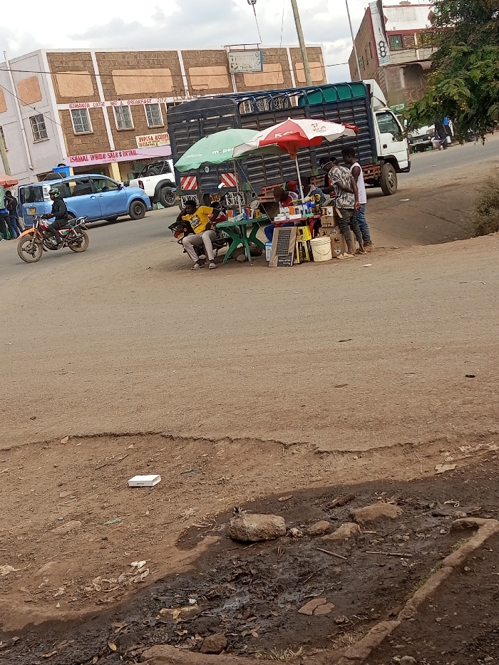 A bustling street scene features a roadside vending stand shaded by two umbrellas, one red and one green. Several men are gathered around the stand. In the background, a large truck sits on the street alongside other vehicles and a motorcyclist. The building on the left reads "NAMANJA LOOSE HED & BREAKFAST" and "ISHMAL WHME-SALE & BETAIL." The foreground shows a rough patch of dirt with visible trash and debris.