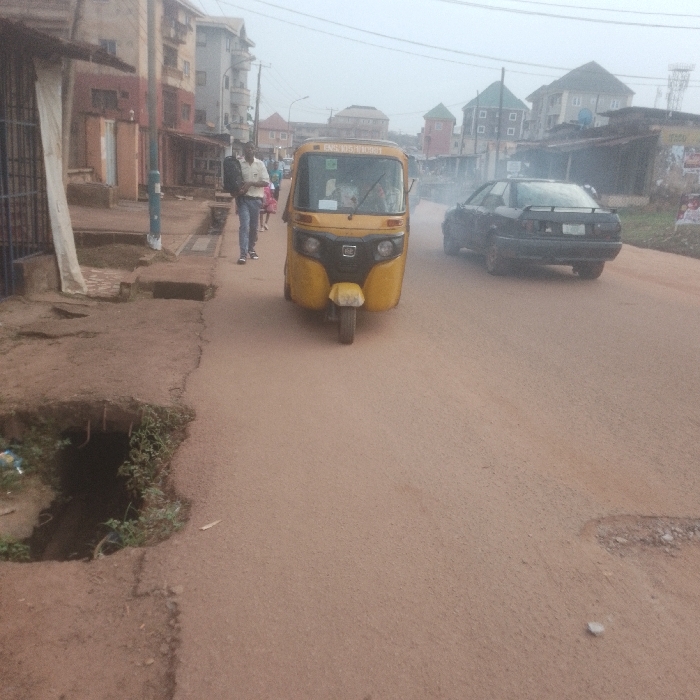 The image displays an urban street scene in Enugu, Nigeria. A reddish-brown, unpaved road occupies the center, showing minor surface irregularities. On the left side of the road, an unpaved sidewalk features a large, uncovered gully or drainage ditch with exposed soil and some green vegetation. A male pedestrian, dressed in a light-colored shirt and blue jeans, is visible walking on this sidewalk, carrying a dark bag in his left hand. A yellow three-wheeled motorized rickshaw, bearing the inscription "ENUGU GOOD" on its front panel, is positioned in the midground, facing towards the viewer. Behind the rickshaw and further down the road, a dark-colored sedan is moving away from the camera, emitting a significant amount of light grey exhaust smoke from its rear. Multi-story residential or commercial buildings line both sides of the street under an overcast or hazy sky. Overhead utility lines are present in the background.