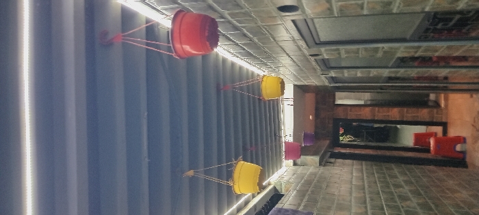 vertically oriented perspective of an interior space. Multi-colored, hanging bucket-shaped planters with red fixtures are affixed to a paneled wall with linear lighting accents. The flooring is tiled, and an open space with a dark framed mirror is visible towards the end. Red objects are also seen near this mirrored area. The ceiling has a grid-like pattern, with various recessed fixtures.