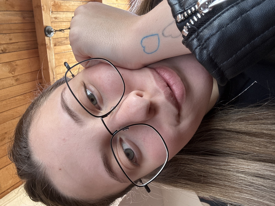 A close-up image depicts a person with light skin tone, brown hair, and greenish-grey eyes, wearing black-rimmed glasses. The person is looking slightly upward and to the right of the frame with a subtle smile, resting their left hand against their cheek. Two outlined heart tattoos, one blue and one faded grey, are visible on the inner left wrist. The person is wearing a black garment and a black faux leather jacket with a silver zipper on the right arm. A thin silver necklace is also visible. The background consists of a wooden slatted ceiling, from which a dark-colored light fixture or hook is partially visible in the upper right. The setting appears to be indoors. The precise location within Dimitrovgrad Municipality, Serbia, cannot be determined from the provided image.